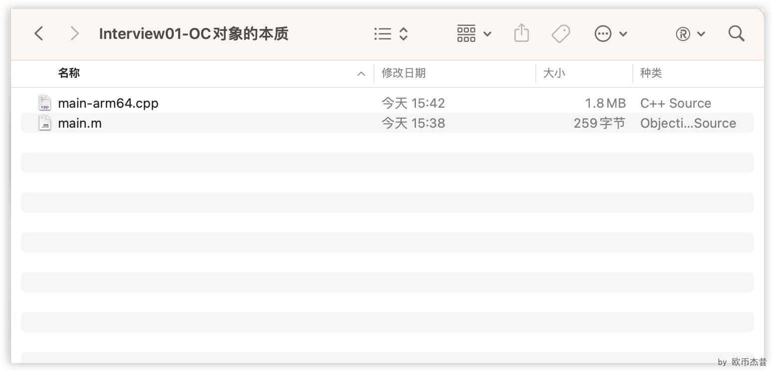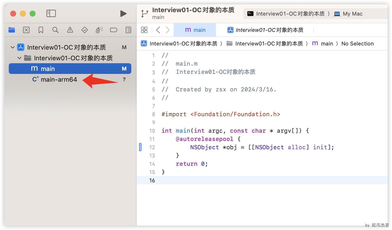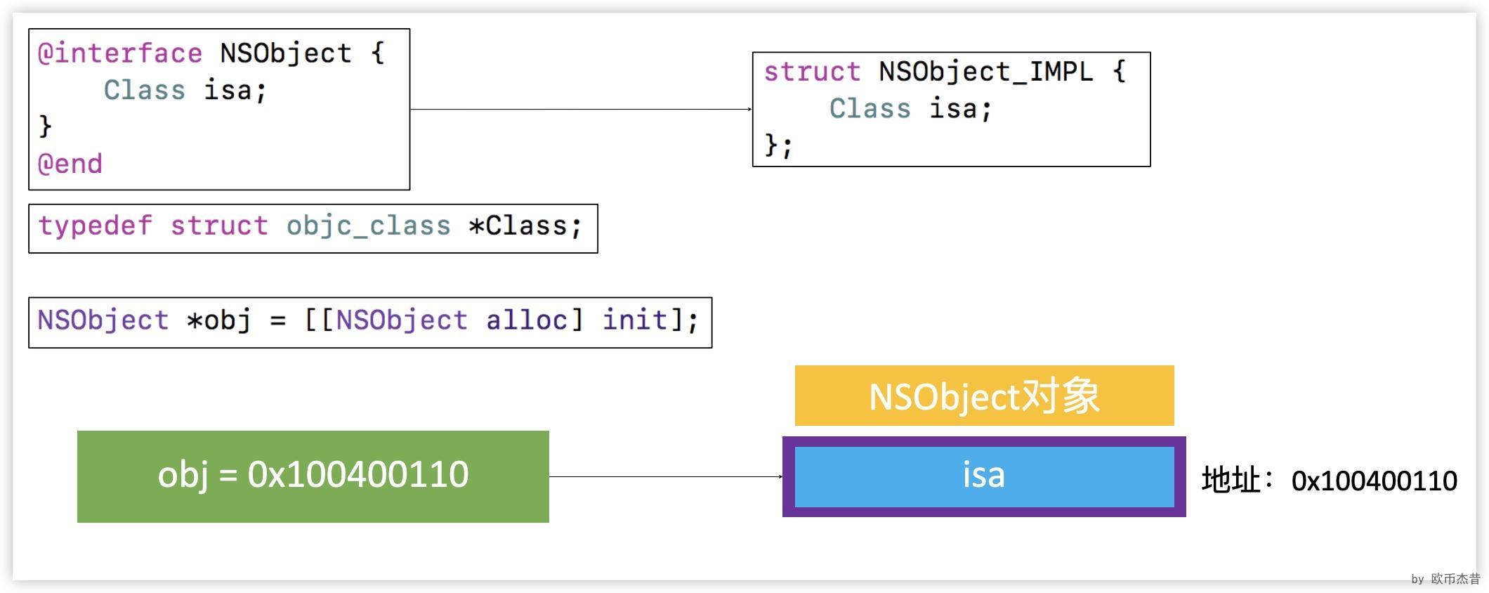 isa成员 NSObject *obj = [[NSObject alloc] init];通过alloc,相当于分配了一段存储空间给这个结构体,然后把创建出来的对象的内存地址赋值给*obj这个指针,所以*obj存储的就是这个对象的内存地址isa的地址其实就是这个结构体的地址,因为结构体里面只有isa一个成员