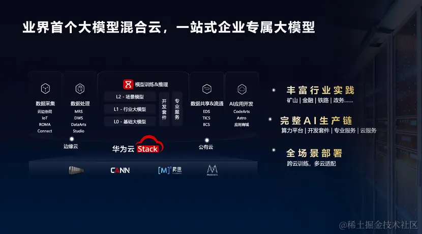 面对政企的“大模型烦恼”,华为云提出了混合云的方案——部署具备边云协同、软硬协同的混合云来构建大模型。