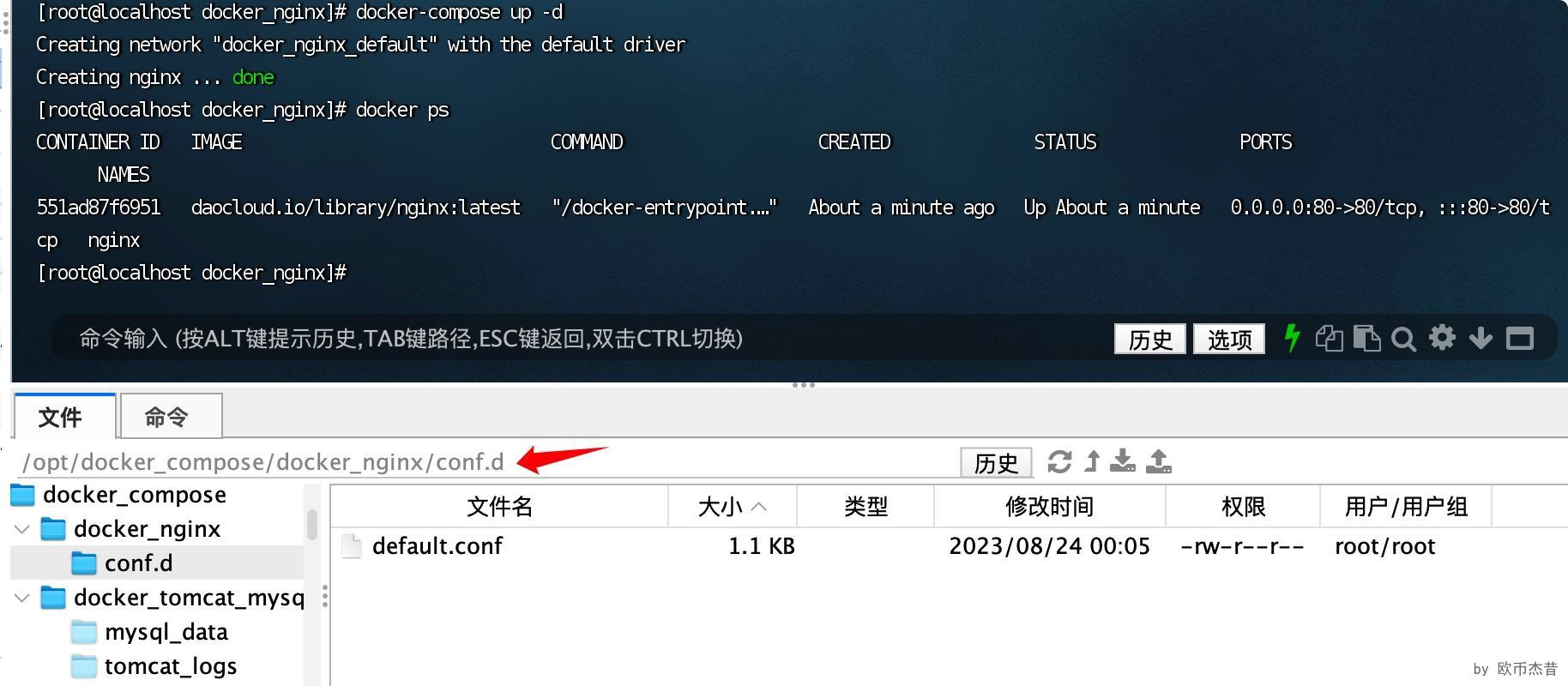 这里注意,使用docker-compose创建容器,挂载的容器卷里面的内容是空的,需要自己在容器卷内创建配置文件,比如 默认端口 默认访问页面的配置 即上文的 default.conf内的配置