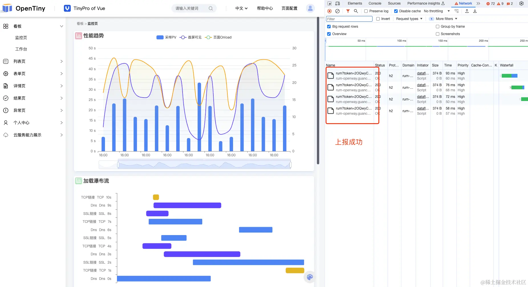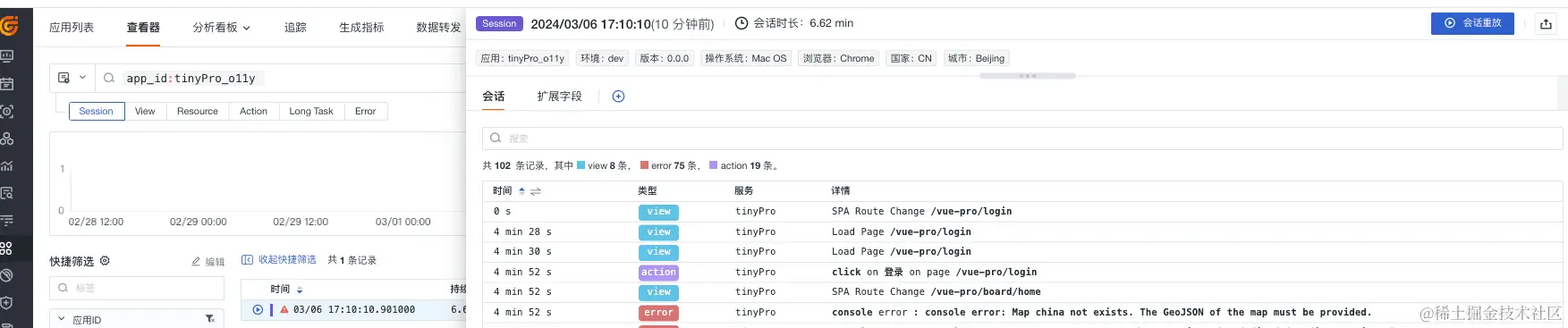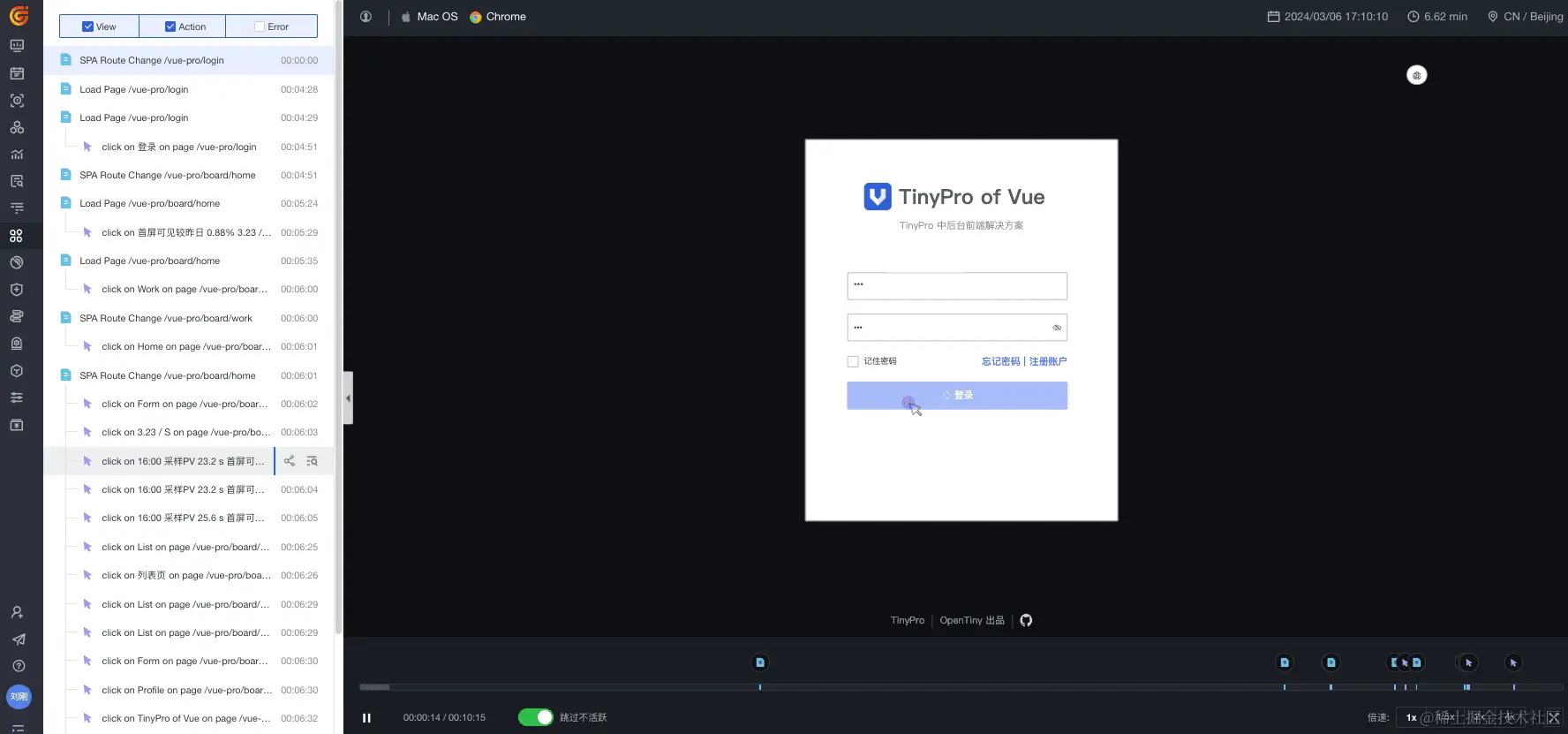 TinyPro 是一套使用 Vue 编写的中后台管理后台框架,官网地址:www.opentiny.design/vue-pro/doc… ,下面以 TinyPro 为例来接入如何实现 Vue 应用的可观测性。