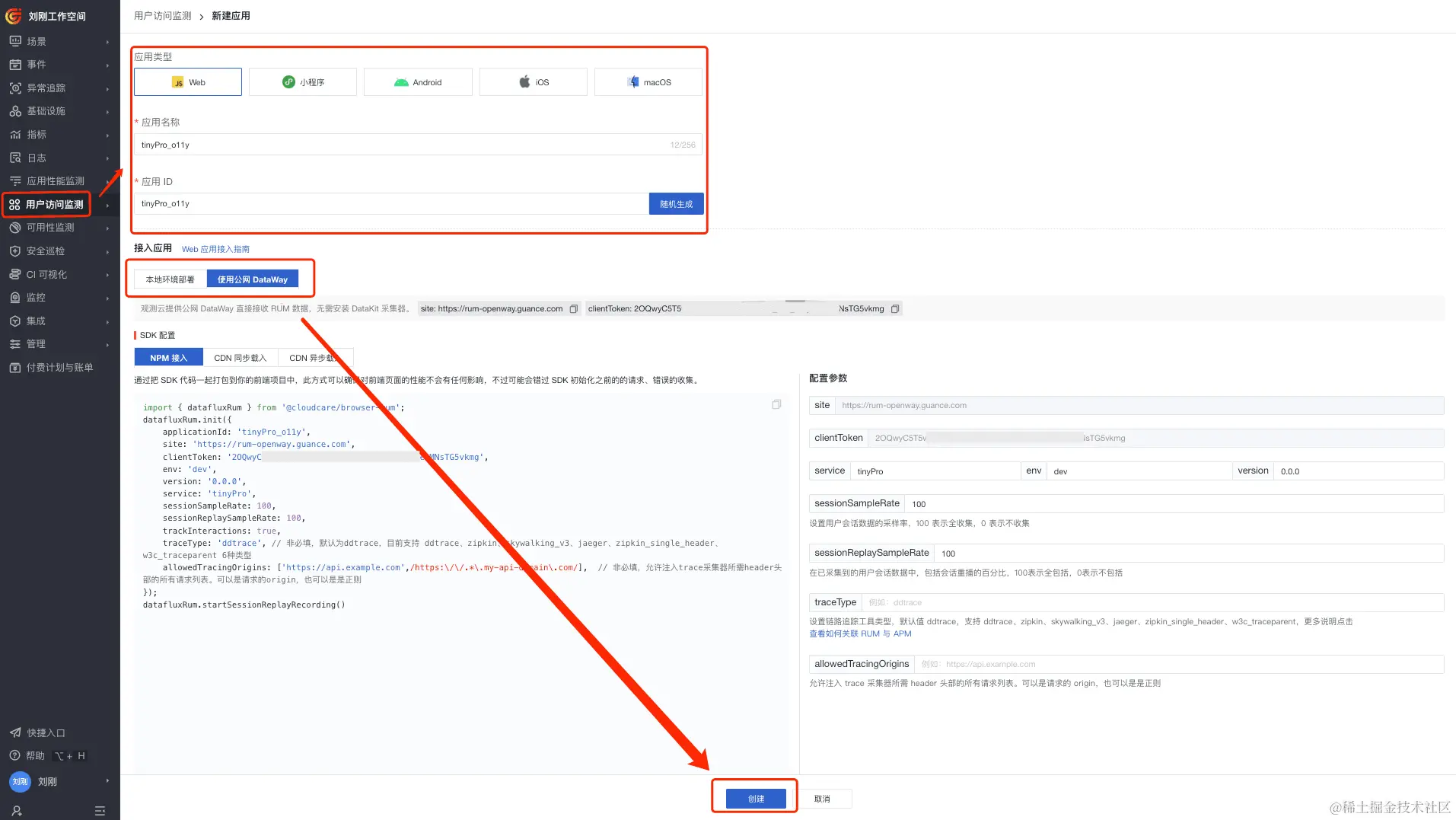 第一步:在观测云创建应用