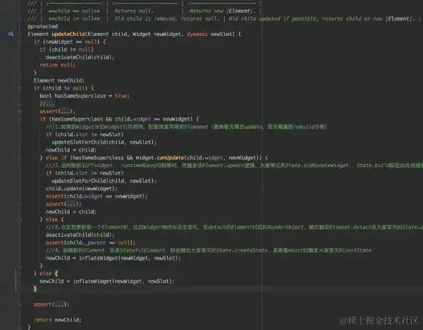缓存不变的Widget有2大好处。1.被缓存的Widget将无需重复创建, 虽然Flutter官方认为Widget是一种非常轻量级的对象,在实际业务中,Build耗时过高仍是一种常见现象。2.返回相同引用的Widget将使Flutter停止该子树后续遍历, 即Flutter认为该子树无变化无需更新。原理请看下图“Element.updateChild源码分析”