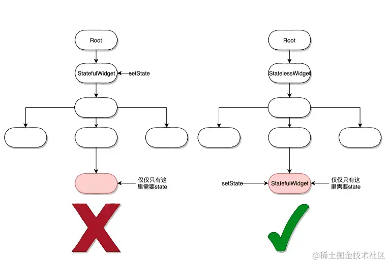 1)、尽量将setState放在叶子节点,好处是build时影响范围极小,简称局部刷新