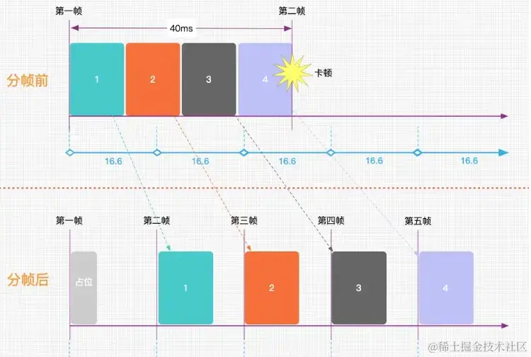 采用分帧之后,在页面的第一帧我们先通过构建简单的占位item,占位的item可以是个简单的Container。由于其构建基本不耗时,在第一帧的时候构建四个Container不会导致卡顿。 之后将实际的四个item,分别延迟到后面四帧进行渲染。这样对于每个16.7ms而言,都没有发生超时渲染,整个流程不会发生卡顿。