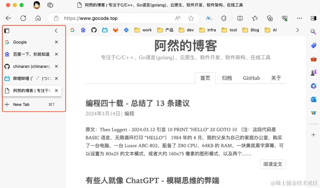 比如,下图中 Edge 浏览器自带的垂直标签页功能(其他浏览器一般需要安装扩展插件)。