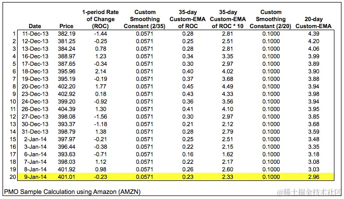 上表来自 Excel 电子表格。请注意,计算中使用了指数移动平均线。这些从简单移动平均线开始,然后使用乘数进行计算,这意味着需要额外的历史数据来达到真实值。点击这里下载此电子表格示例"),并在家里尝试。