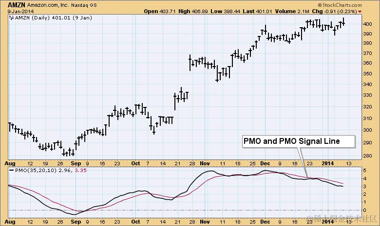 第一部分,即双重平滑价格变化,为 TSI 设定了正面或负面的基调。当双重平滑价格变化为负时,指标为负,当为正时,指标为正。双重平滑绝对价格变化对指标进行了标准化,并限制了随后振荡器的范围。换句话说,该指标衡量了双重平滑价格变化相对于双重平滑绝对价格变化的情况。一连串的大幅正价格变化导致相对较高的正读数,因为这表示强劲的上行动量。一连串的大幅负价格变化将 TSI 推入深度负值区域。