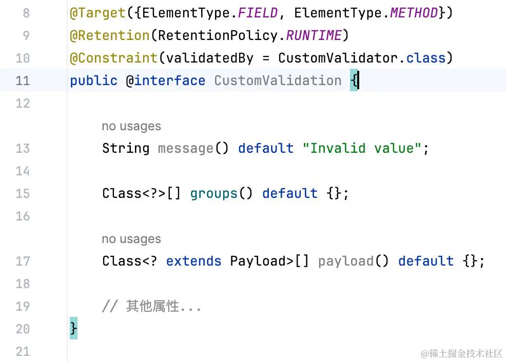 首先,我们需要创建一个自定义的注解类,使用 @Constraint注解标注,并指定校验器类。在注解类中,我们可以定义一些属性来配置校验规则,比如: