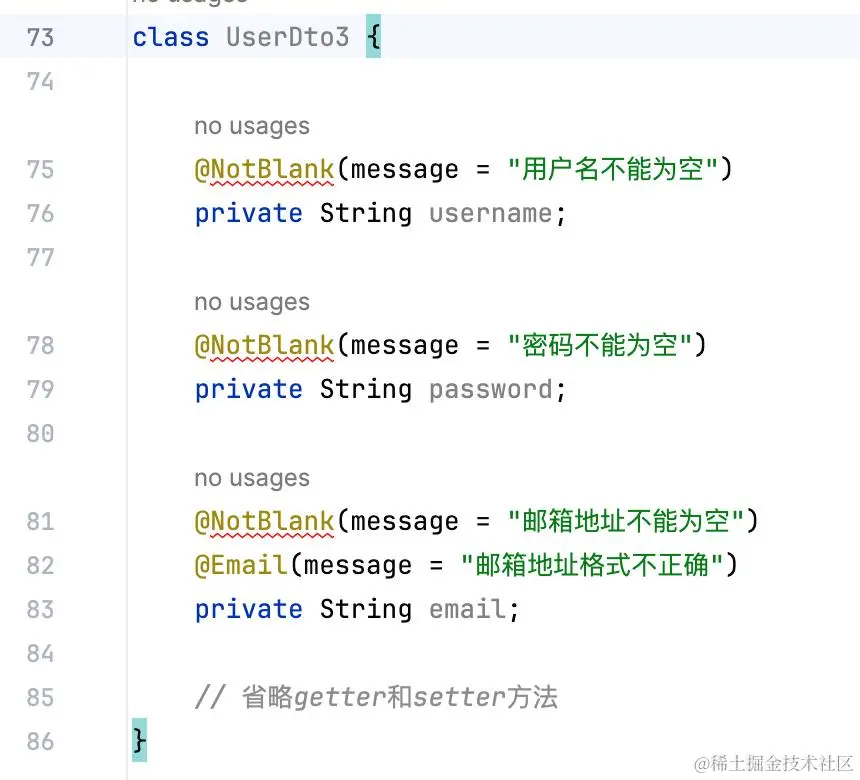 举例来说,假设我们有一个用户注册的功能,用户需要提供用户名、密码和邮箱地址来完成注册。我们可以定义一个UserDto对象来封装这些参数,并在对象的属性上使用校验注解来进行校验。