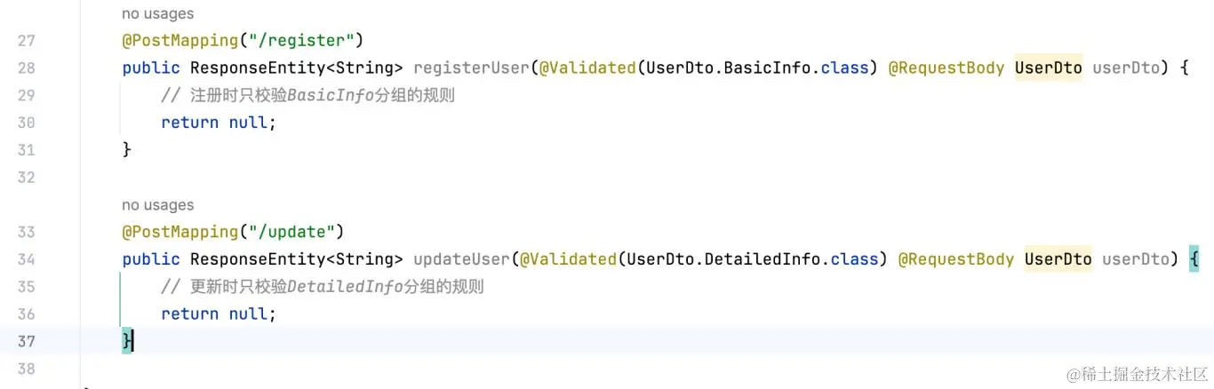 在参数校验的实际应用中,有时候我们可能需要对不同的校验规则进行分组处理。比如,在某个场景下我们需要对用户提交的注册信息进行基本校验,而在另一个场景下我们又需要对用户的详细信息进行更严格的校验。这时候,分组校验就能发挥作用了。