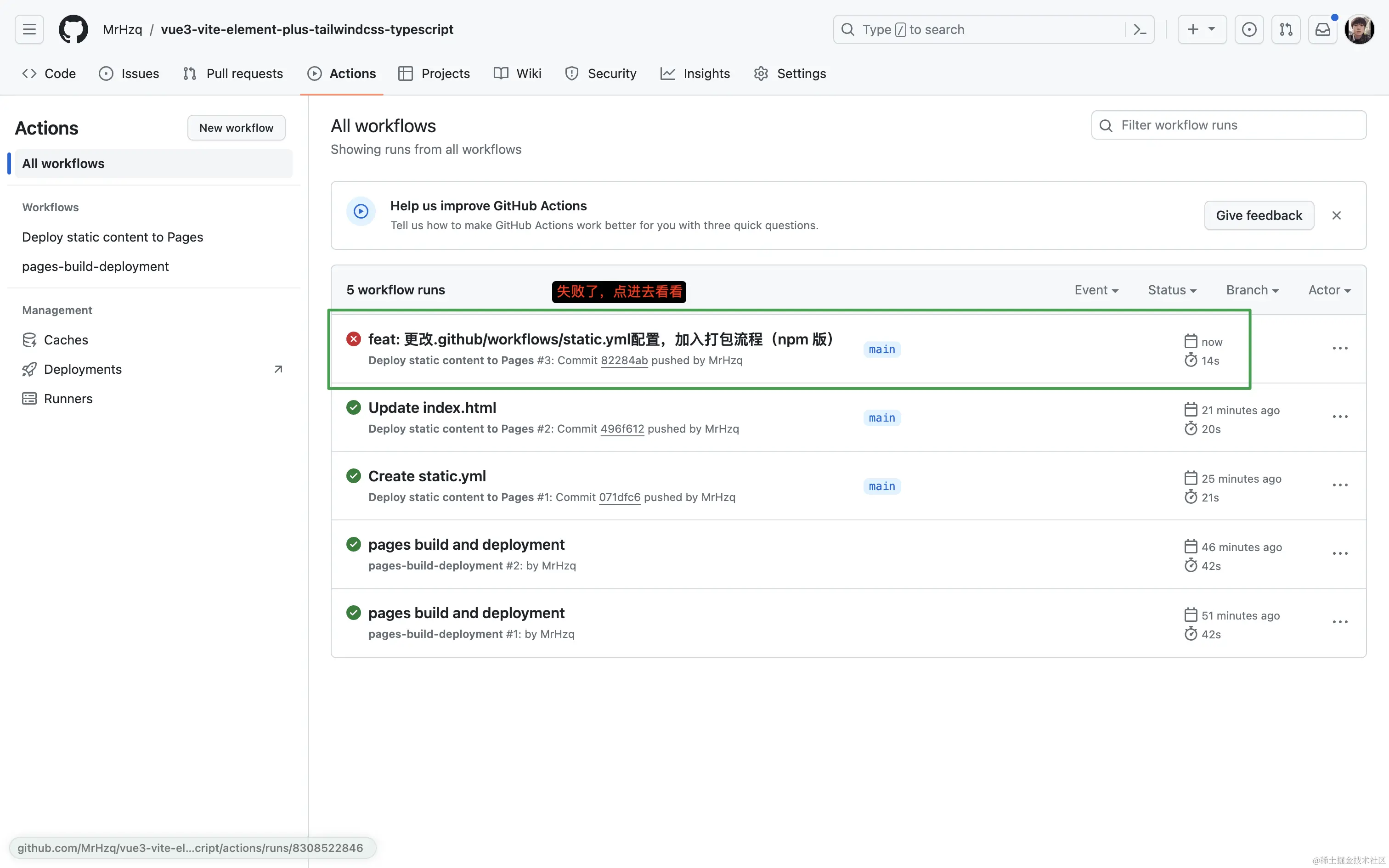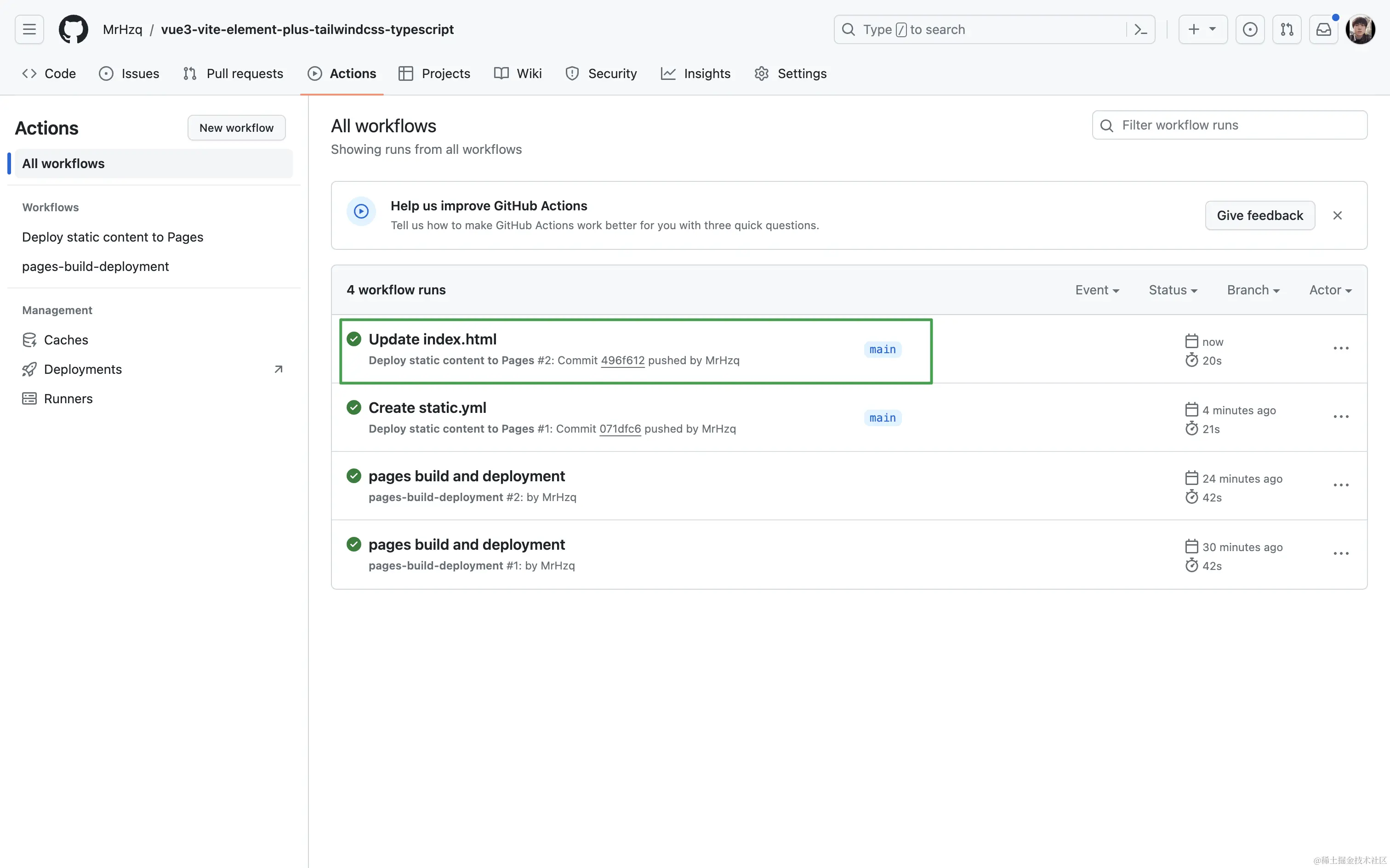 - actions 成功后,打开项目的 github pages 访问地址,看看是否对了,已经对了