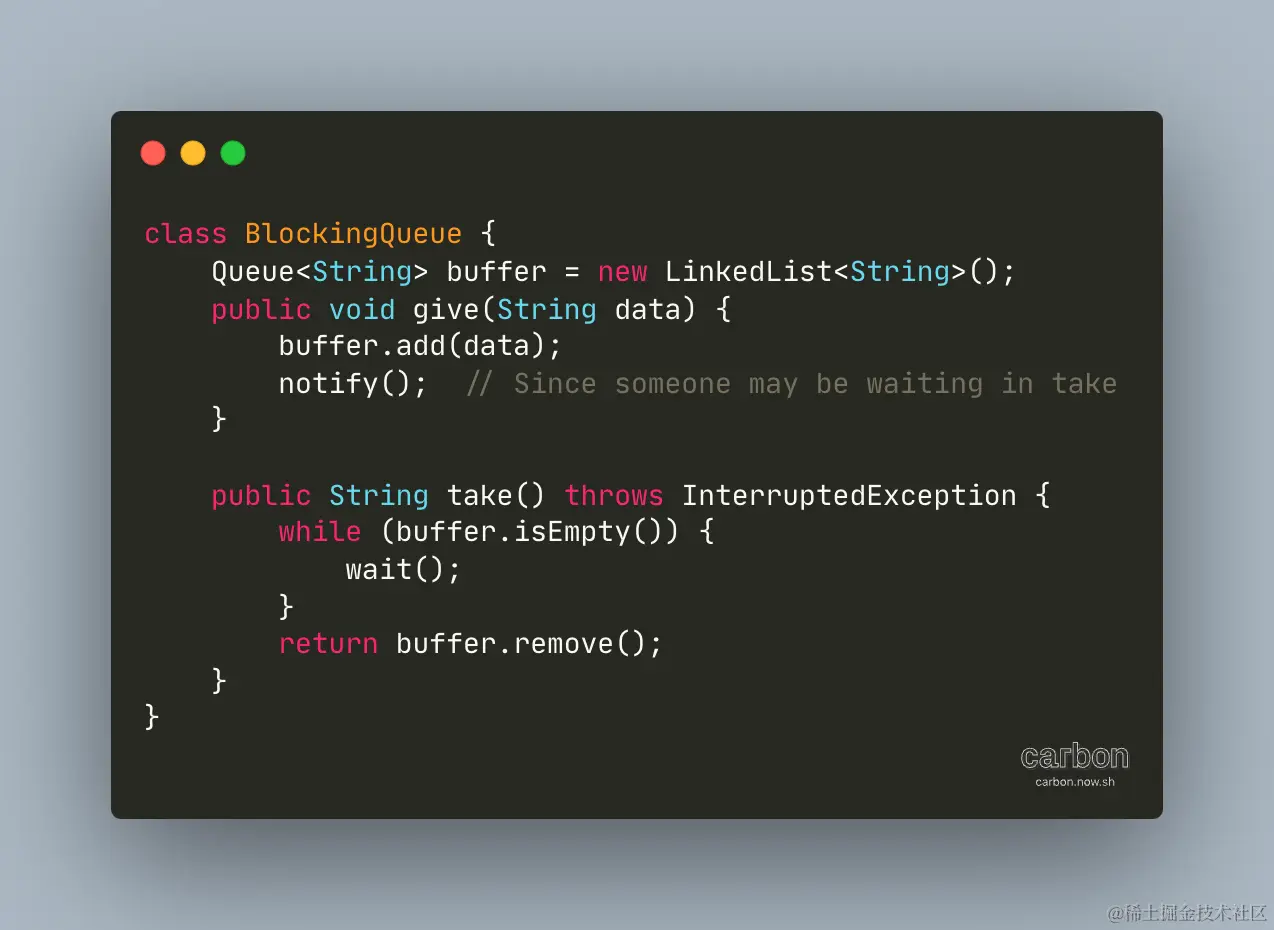 在代码中可以看到有两个方法,give 方法负责往 buffer 中添加数据,添加完之后执行 notify 方法来唤醒之前等待的线程,而 take 方法负责检查整个 buffer 是否为空,如果为空就进入等待,如果不为空就取出一个数据,这是典型的生产者消费者的思想。