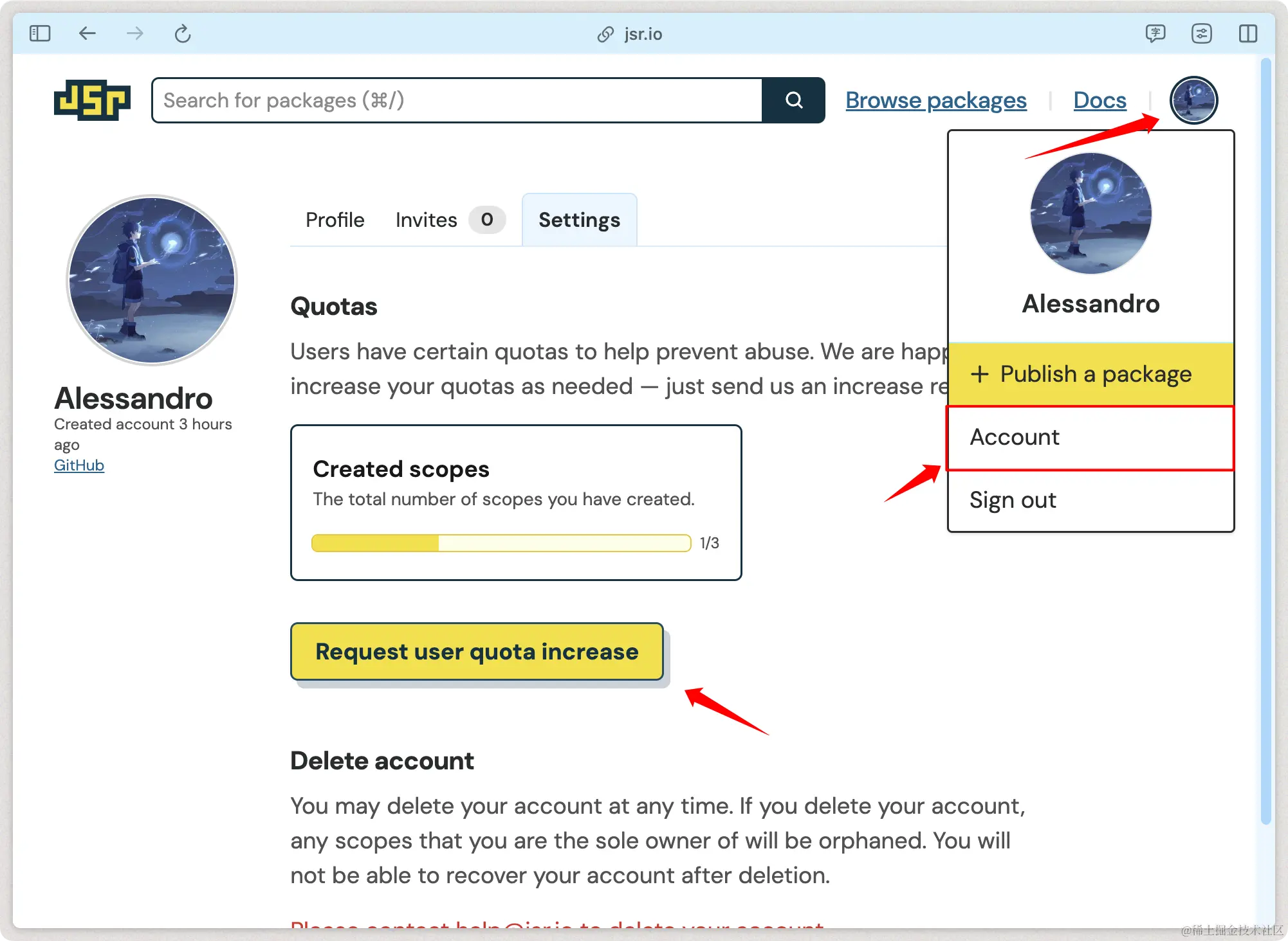 JSR 官方为了避免资源滥用,所以对每个用户做了 scope、package 的配额限制,默认创建三个 scope,至于包的数量,在官方文档中提到了 package 数量也有限制,但我没找到具体配额。