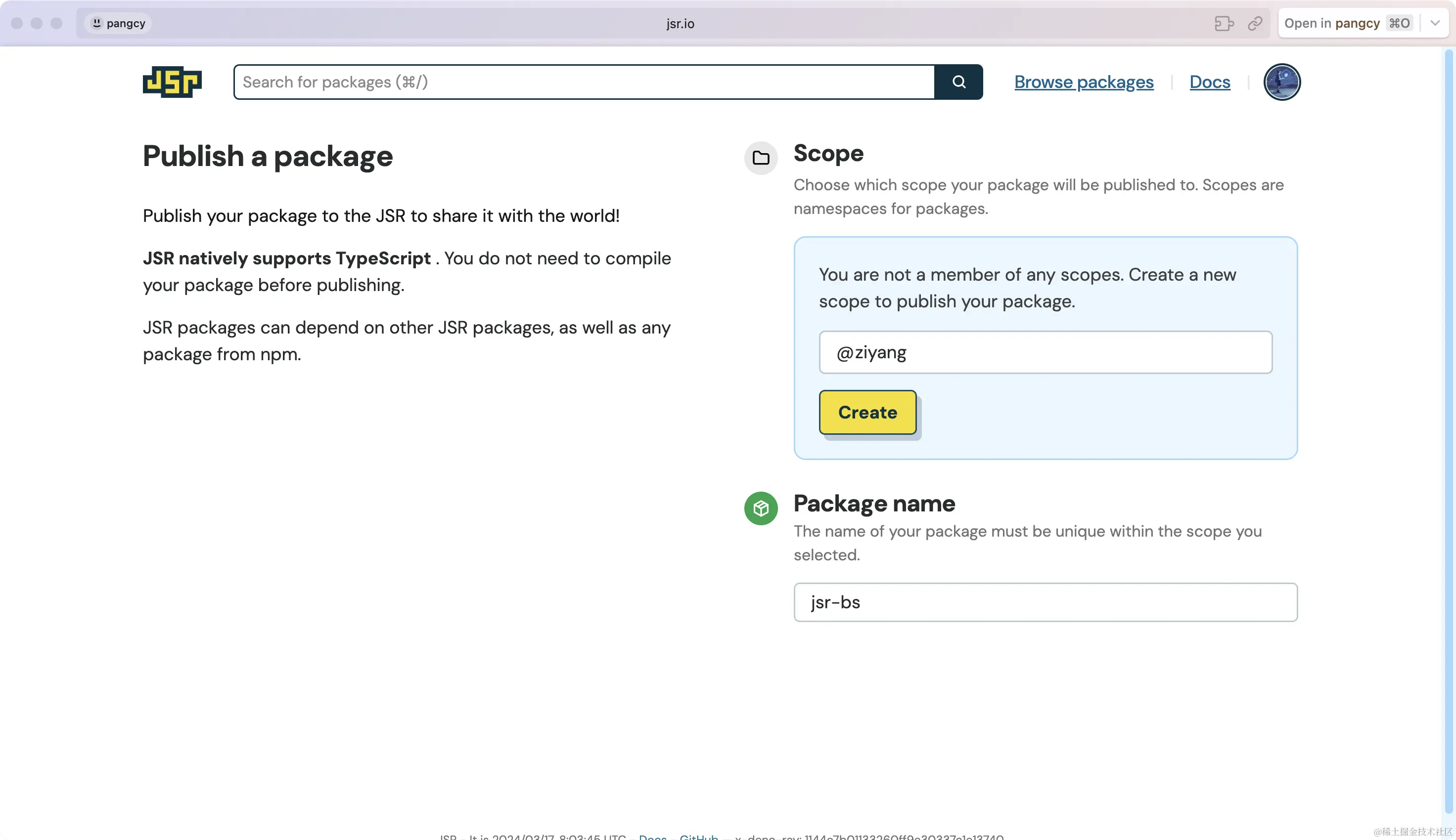 - 执行命令后,JSR 会打开浏览器,首次发布时会要求创建作用域和包名称