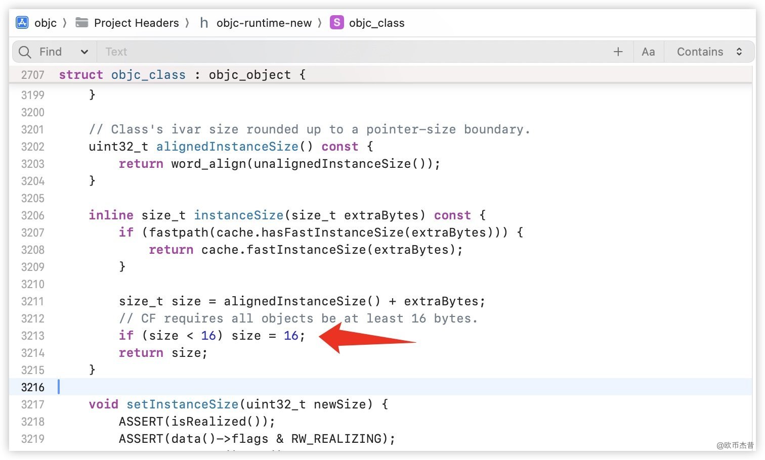 class_getInstanceSize打印的是对象所占用的大小,malloc_size打印的是指针所指向那块内存的大小 - 所以,一个NSObject对象占用的是16字节,但实际利用的只有 8 个字节
