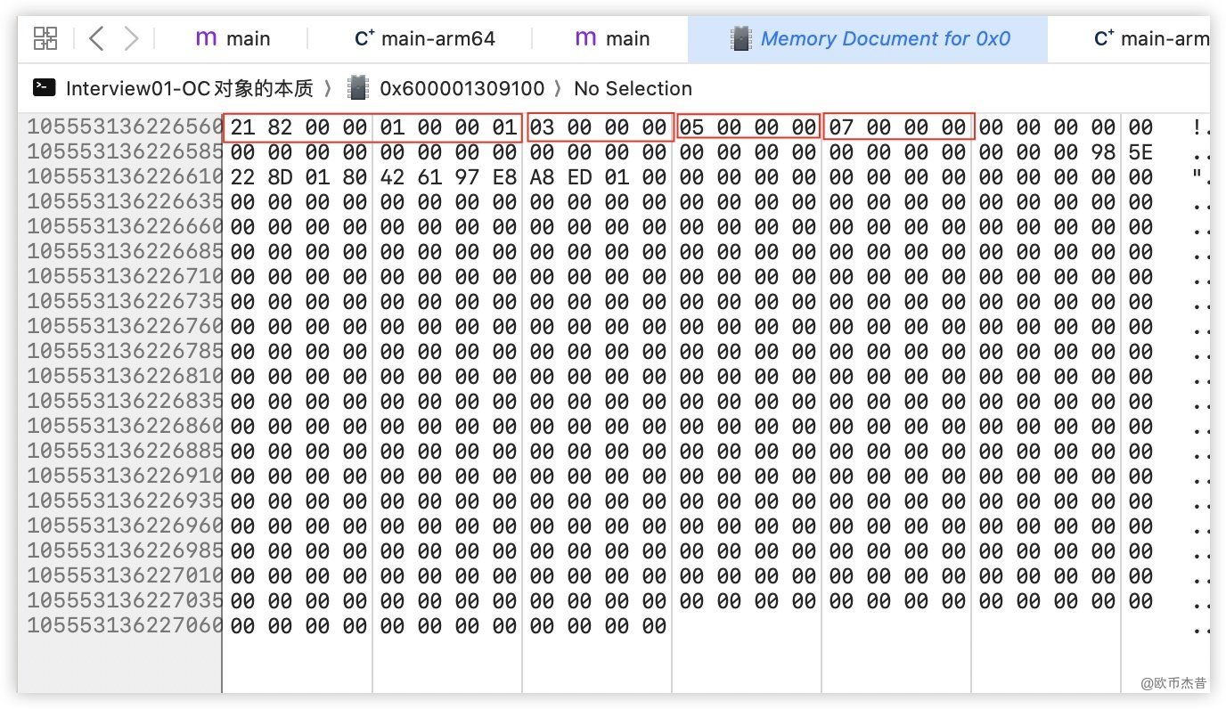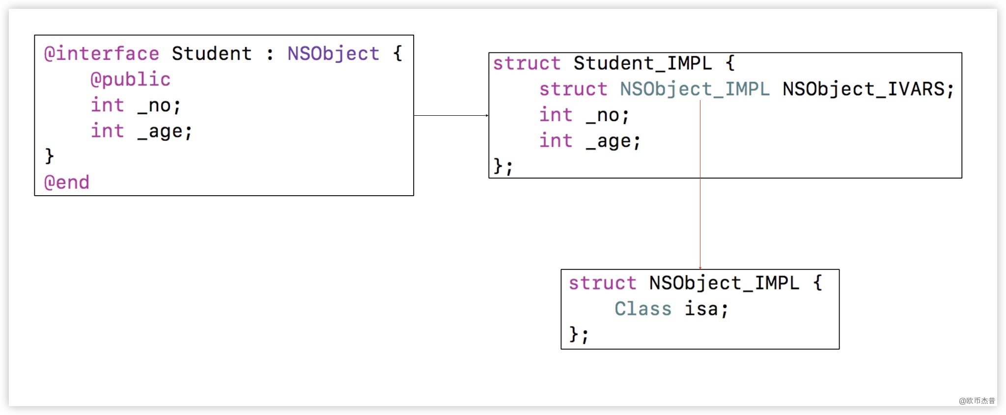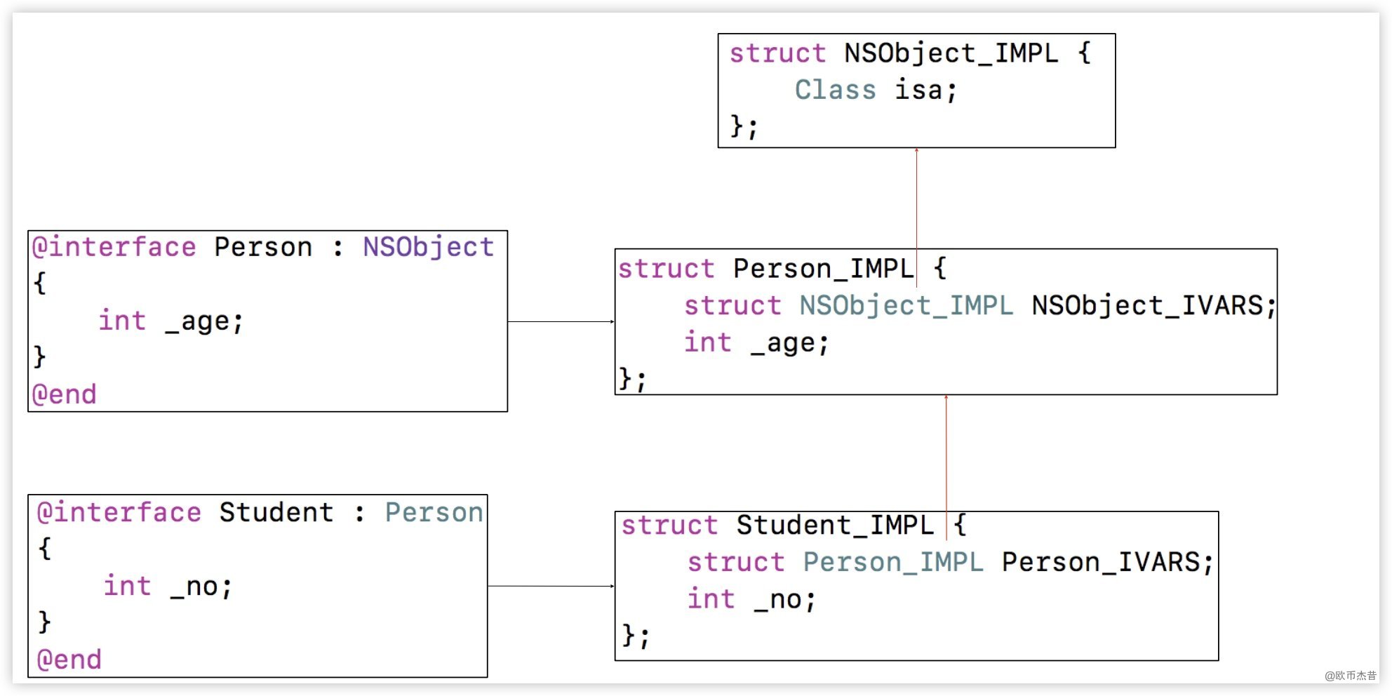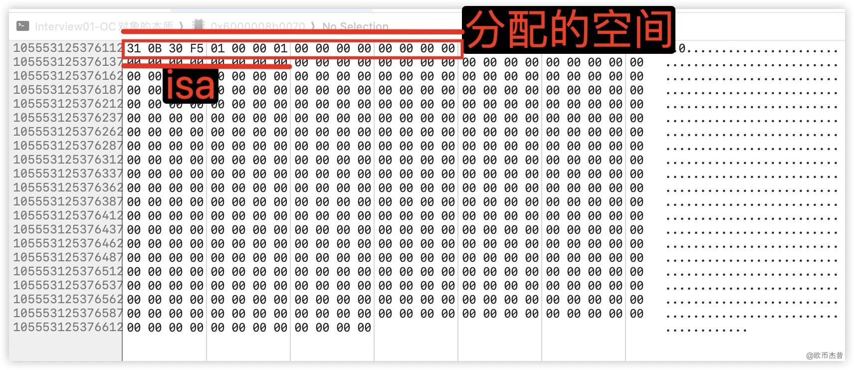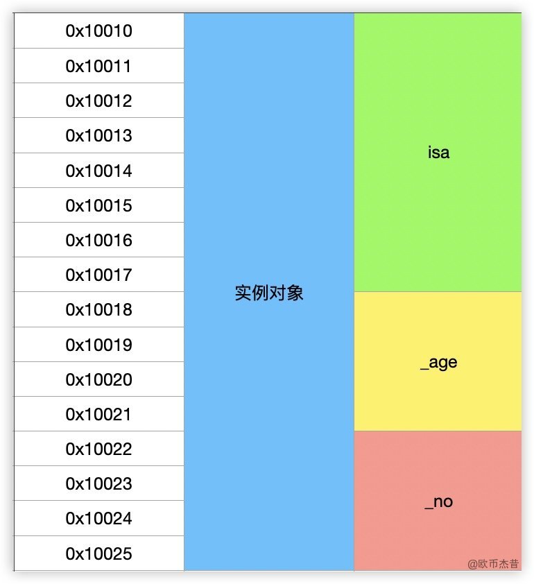 - 我们在 NSObject 基础上,又声明了一个int类型的_no,一个int 类型的_age,int类型占用 4 个字节,2 个 int 就是 8 字节,加上 isa 的 8 字节,刚好就是 16 字节