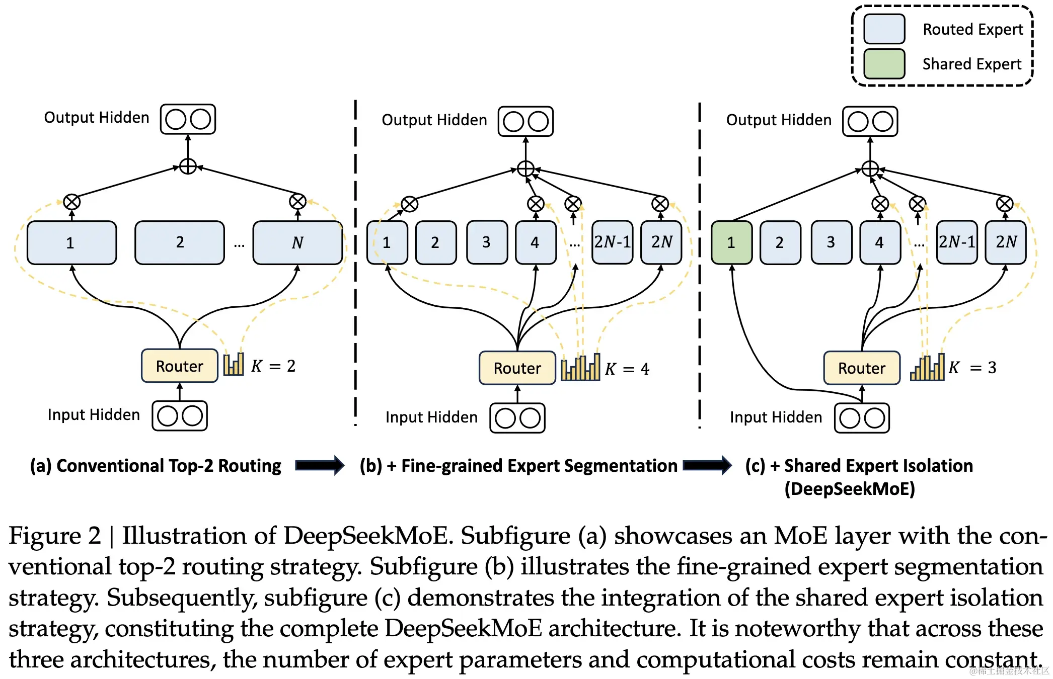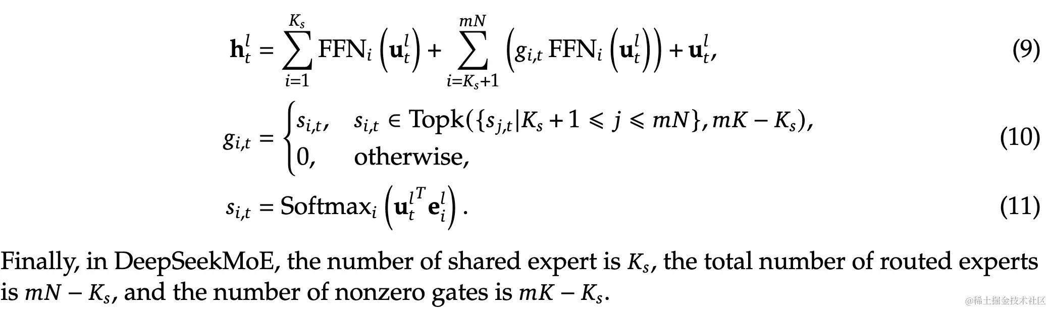 Fine-grained Expert Segmentation:细地将专家划分为个,激活其中的个,实现激活的专家更灵活的组合Shared Expert Isolation:将单独看做共享专家,用于捕获常识以及缓解路由专家中的冗余知识