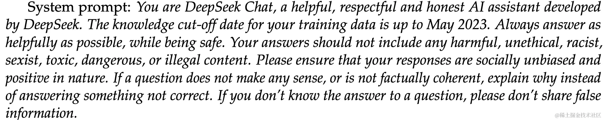 system prompt时,7B LLM性能有一点下降,而67B的LLM性能有比较显著提升。我们认为更大的模型能够更好地理解system prompt的意图,从而更好地遵循指令、得到更好的回复。小模型很难充分掌握system prompt,同时训练和测试的不一致对性能产生了负面影响。
