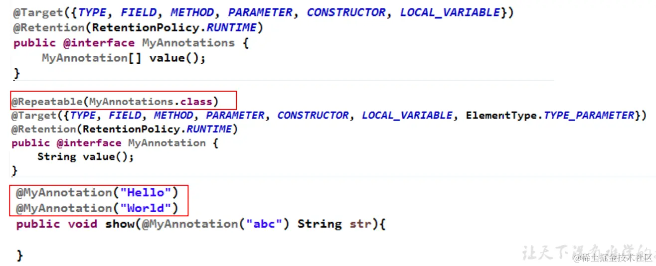 - 在Java 8之前,注解只能是在声明的地方所使用,Java8开始,注解可以应用在任何地方。