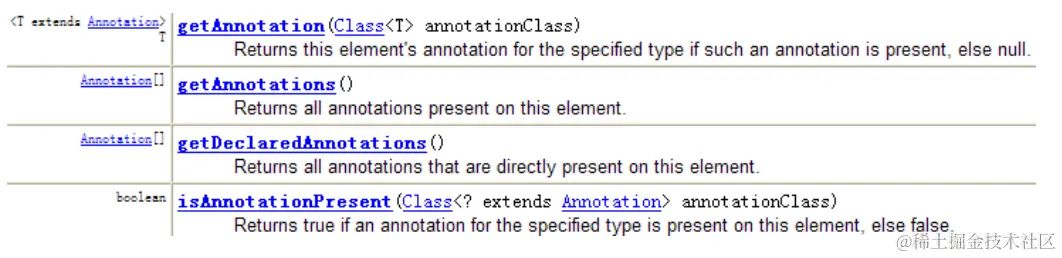 - 程序可以调用AnnotatedElement对象的如下方法来访问Annotation信息