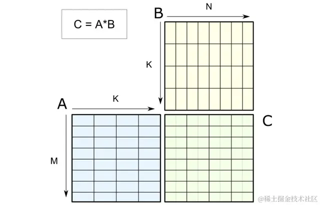 对M乘K的输入矩阵A和K乘N的输入矩阵B进行的M乘N乘K的张量核心操作, 得到M乘N的输出矩阵C。