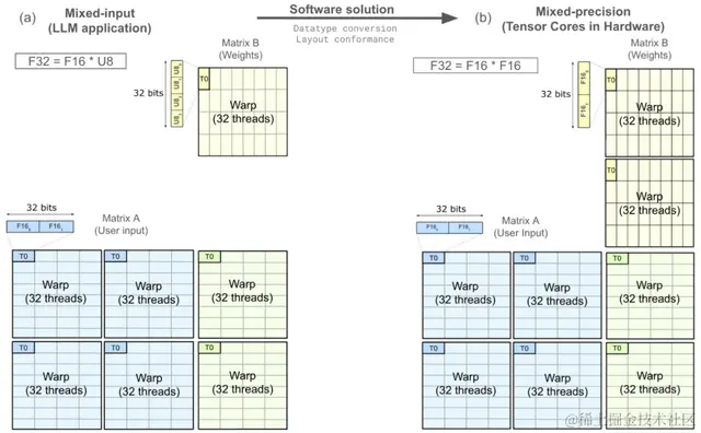 将软件中的混合输入(F32=F16U8)操作映射到硬件中原生支持的warp级张量核心(F32=F16F16)。原图来源:《在NVIDIA A100上开发CUDA核心以充分发挥张量核心的性能极限》。