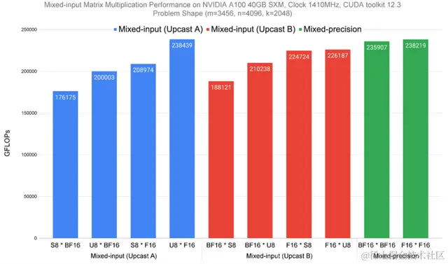 在NVIDIA A100 40GB SMX4芯片上,针对一个计算受限的矩阵问题,测试混合输入矩阵乘法的性能,其矩阵大小为m=3456,n=4096,k=2048。