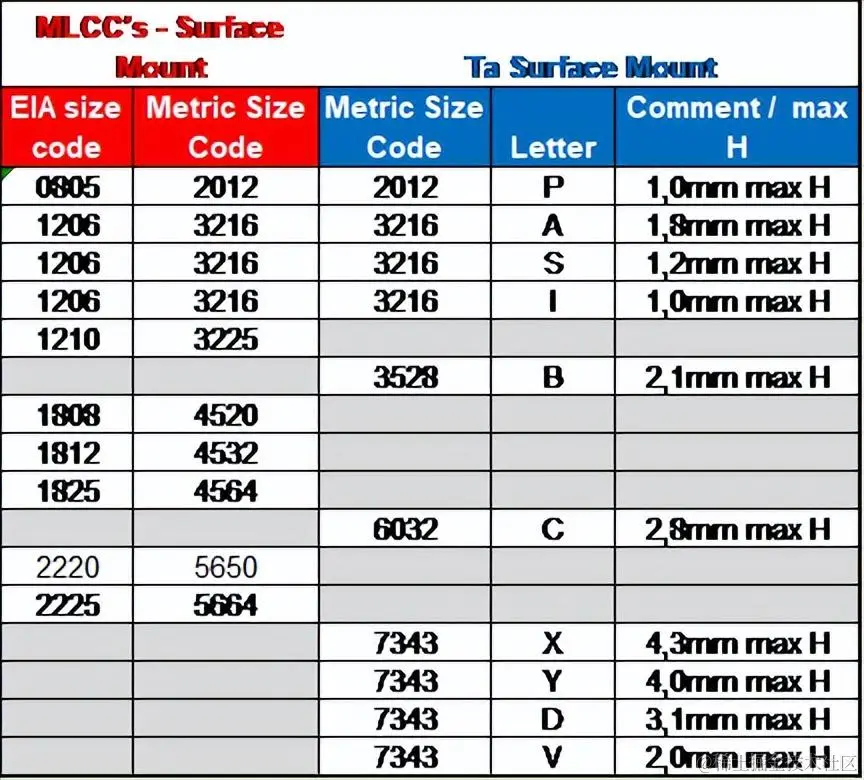 几何尺寸是第一个需要匹配的参数。 表1给出了MLCC和聚合物钽电容之间的尺寸比较。MLCC 常用的EIA代码0805和1206和聚合物使用的Metric 尺寸P-2012和A-3216尺寸是100% 匹配的,尽管从电容本身尺寸上看,更大的MLCC EIA代码1210和聚合物3528就不是100% 的匹配,但是从实际的焊盘面积看,也是可以相互替换的。至于更大尺寸的MLCC 1808~2225, 就需要考虑修改PCB 设计了。