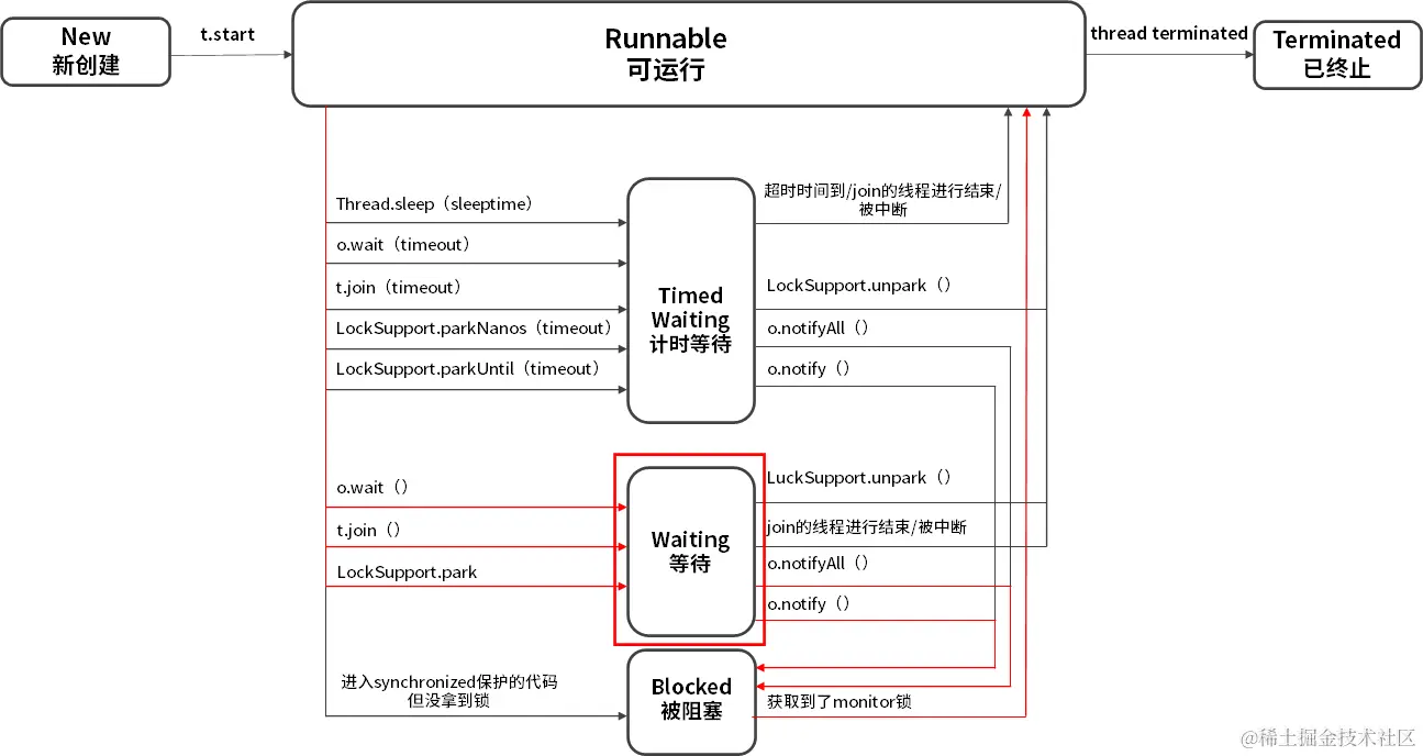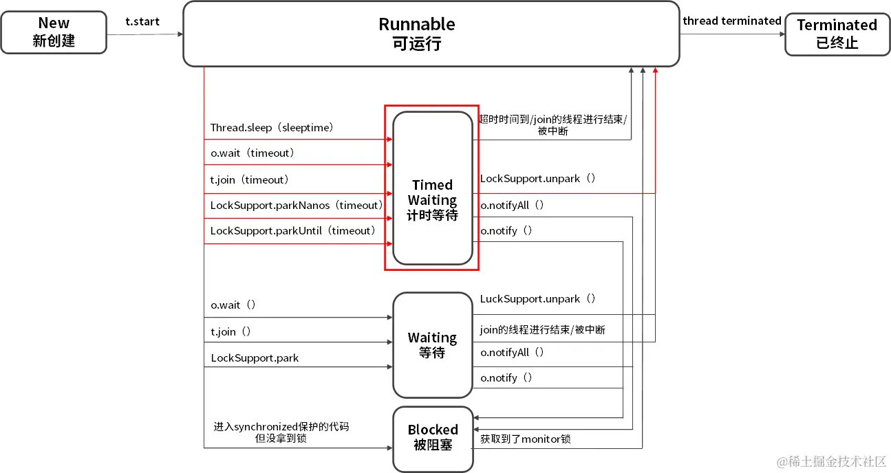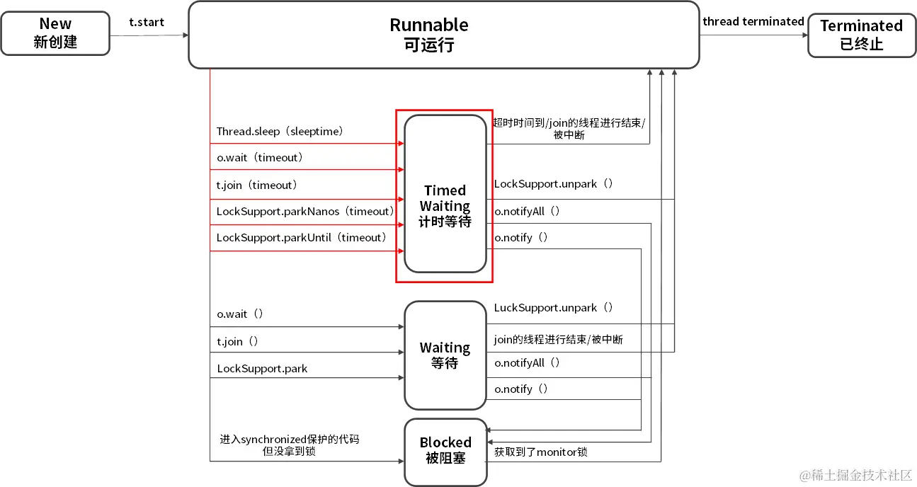 当然对于 Timed Waiting 而言,如果它的超时时间到了且能直接获取到锁/join的线程运行结束/被中断/调用了LockSupport.unpark(),会直接恢复到 Runnable 状态,而无需经历 Blocked 状态。