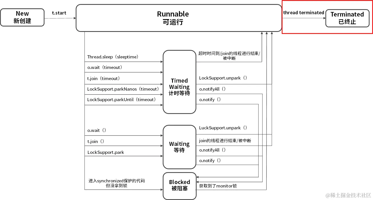 - 线程生命周期不可逆:一旦进入 Runnable 状态就不能回到 New 状态;一旦被终止就不可能再有任何状态的变化。所以一个线程只能有一次 New 和 Terminated 状态,只有处于中间状态才可以相互转换。