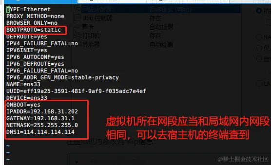 VMWare的虚拟机属性->网络连接采用桥接模式: