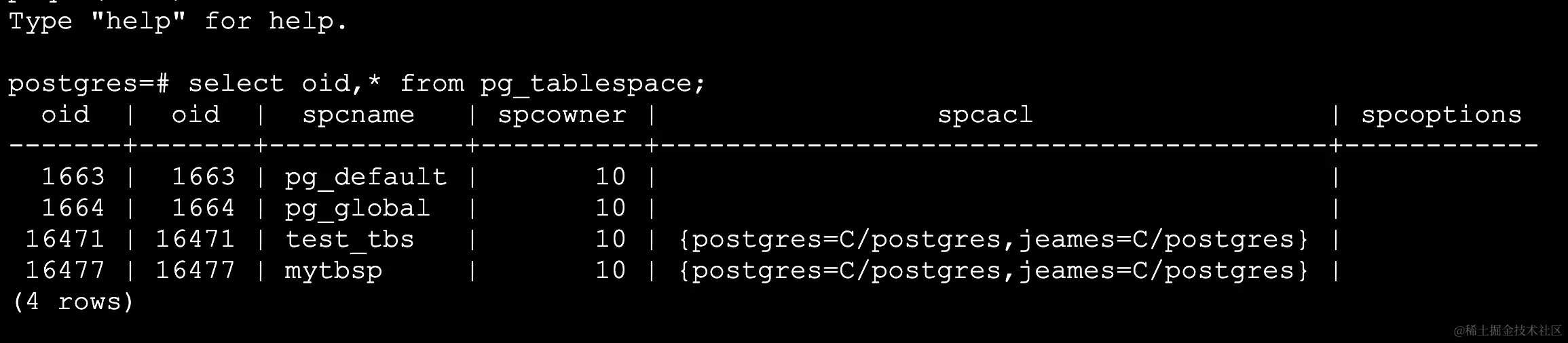 16477 | 16477 | mytbsp | 10 | {postgres=C/postgres,jeames=C/postgres} |