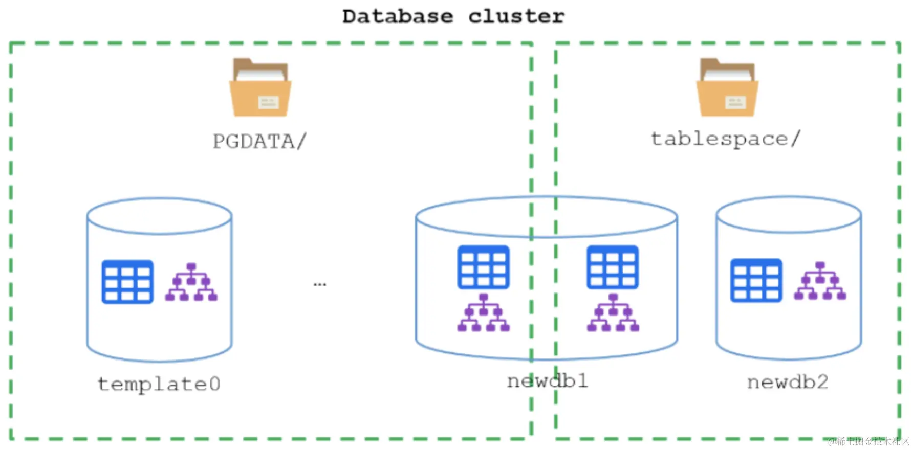 3.多对多的关系:在PostgreSQL集群中,一个表空间可以被多个数据库使用,