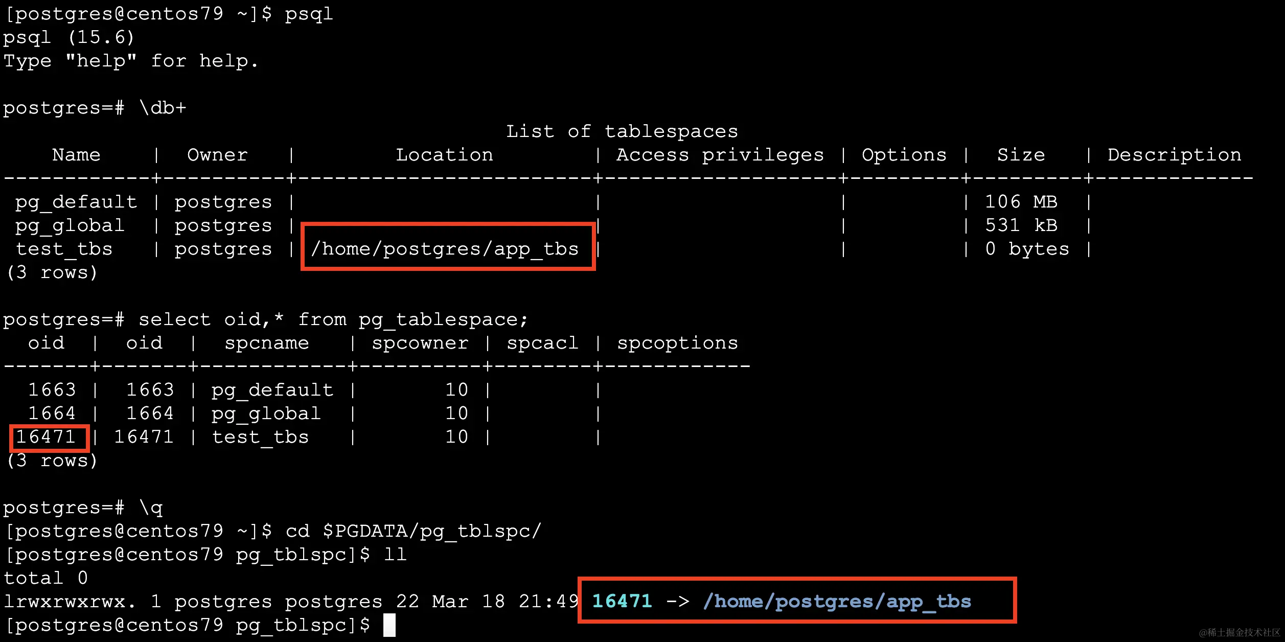 指向表空间设定的路径,此处为/home/postgres/app_tbs