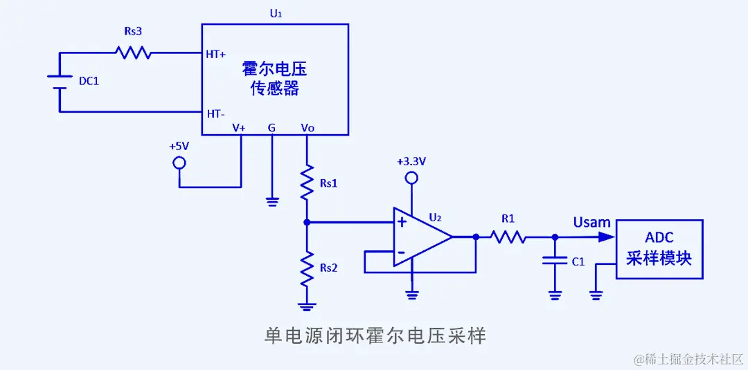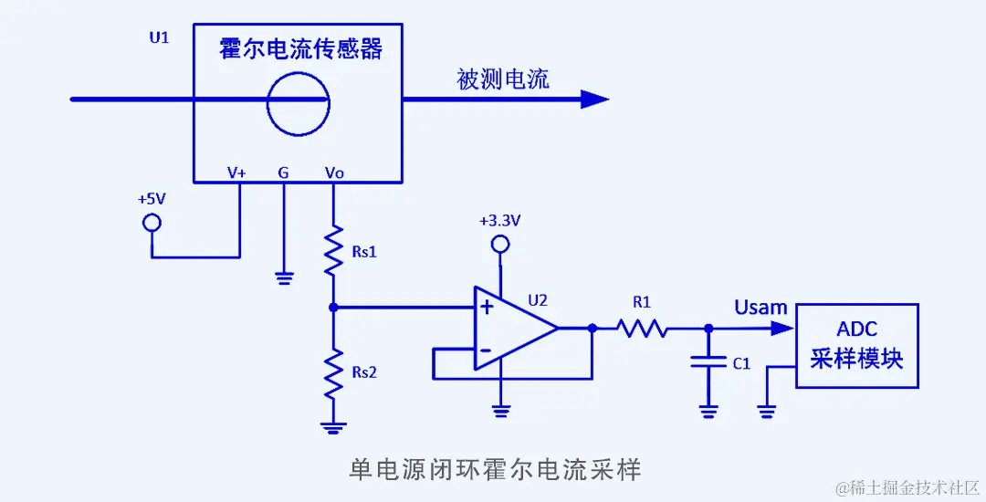 以单电源闭环霍尔电流采样为例:待测电流穿过霍尔电流传感器U1会产生一个幅值在0~V+之间的输出电压值Vo。Vo经分压电阻Rs1与Rs2后接入运放U2,随后经低通滤波器(R1、C1)后接入ADC采样单元。U2、Rs1与Rs2作用可参考霍尔电压采样电路。