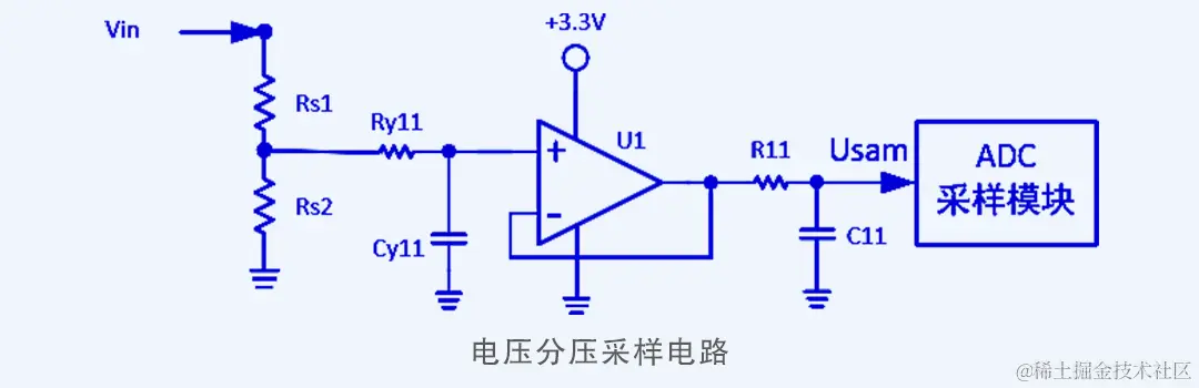 输入电压Vin经过Rs1与Rs2分压后经过输入侧滤波(Ry11、Cy11)接入运算放大器U1,再经过输出端滤波(R21、C21)接入ADC采样模块,运算放大器U1起电压跟随作用。U1、U2运放需要选取低压轨至轨、低失调电压运放,建议与ADC采样模块同电源供电。