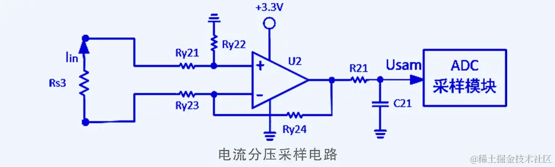 在待测支路中串联采样电阻Rs3,并将电阻两端电压接入运算放大器U2中。电路中U2以及电阻Ry21-Ry24构成的差分电路。差分电路的输出经过滤波器(R11、C11)后接入ADC采样模块。U1、U2运放需要选取低压轨至轨、低失调电压运放,建议与ADC采样模块同电源供电。