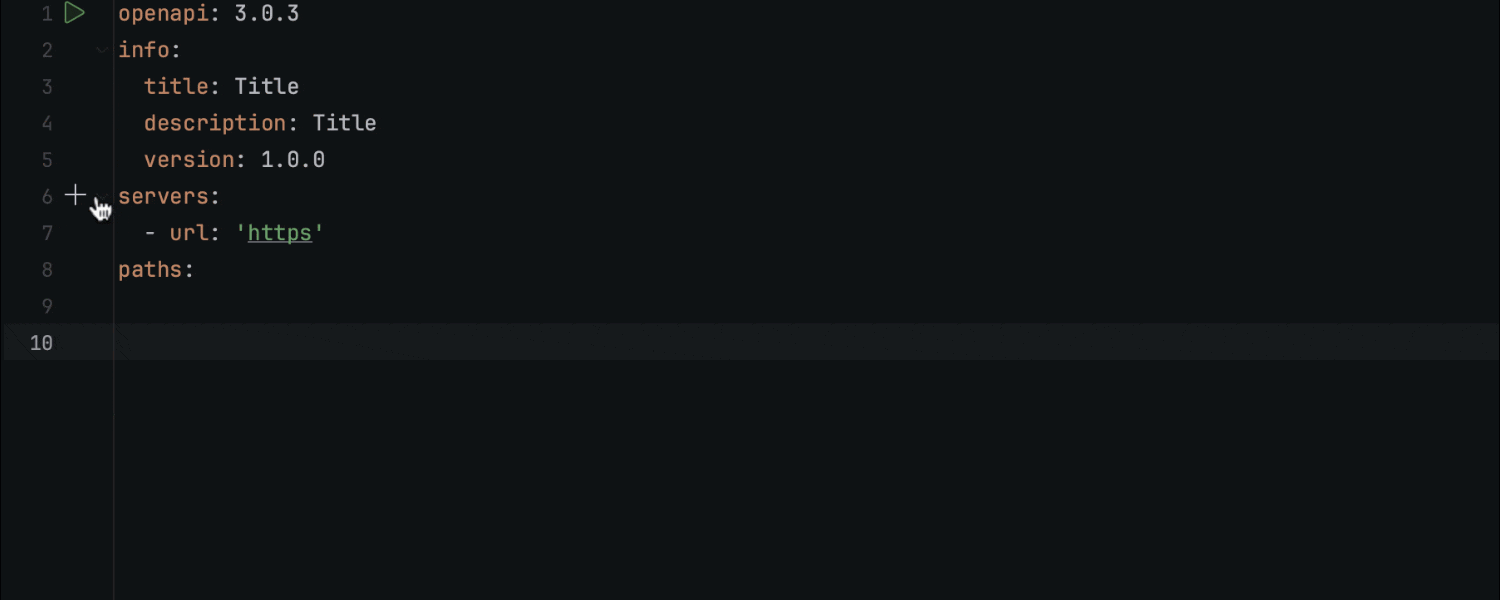 我们实现了可视化编辑功能,帮助您使用实时模板快速编写格式良好的 OpenAPI 规范。这些操作适用于 YAML 和 JSON 文件。要插入对象的模板,只需将鼠标悬停在装订线中的相关行上,然后单击 + 图标。