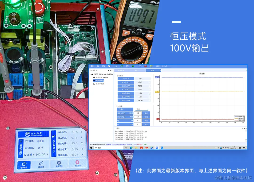 开环验证无误后,点击PPEC Workbench软件设备控制区的“运行”按钮,并利用万用表测量输出电压,如下图(a)所示:设定电压100V,闭环输出电压稳定在99.7V,闭环调试结果符合预期。同样的,可以按照上述步骤进行恒流电源的设计与调试,这里就不再赘述,输出1A的恒流源的闭环调试结果如下图(b)。