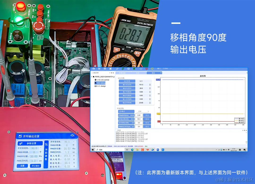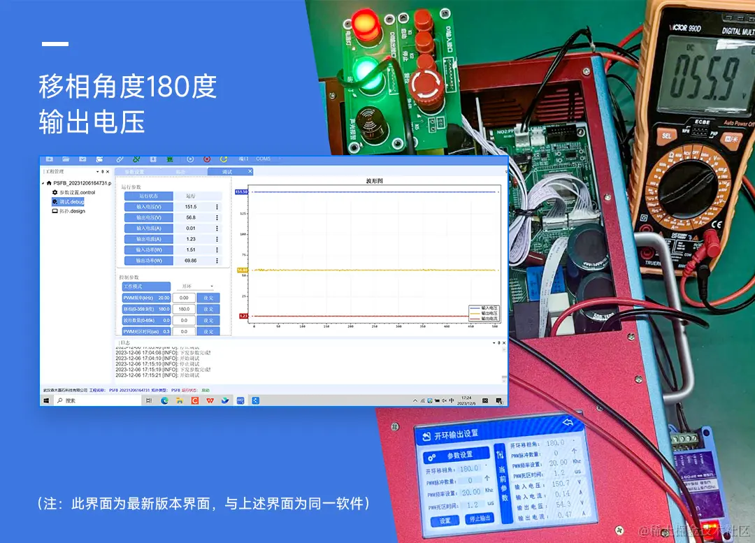 大家可根据前文介绍的参数设计方法进行电源拓扑的器件选型,再按照外围电路设计图搭建PWM驱动电路、采样电路以及保护电路并与电源控制核心进行连接。移相全桥DC-DC变换器的硬件测试平台如图。