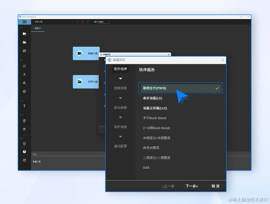 - 选择“移相全桥(PFSB)”拓扑;