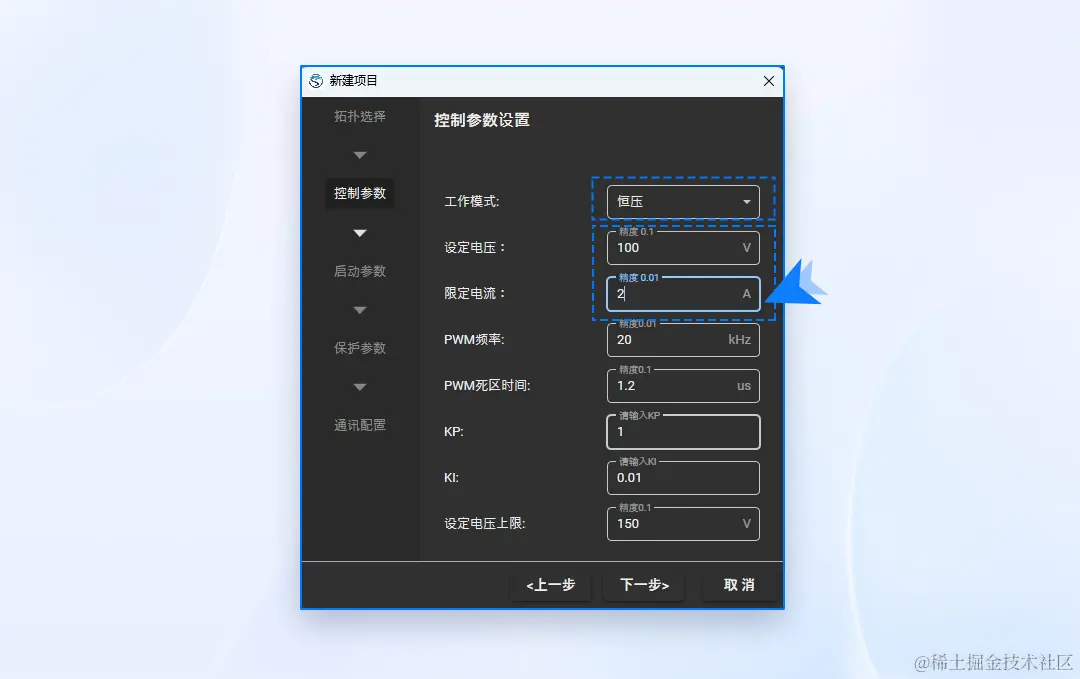 这里以恒压工作模式为例,设定电压100V,限定电流2A,其他参数可参考下图进行设计。