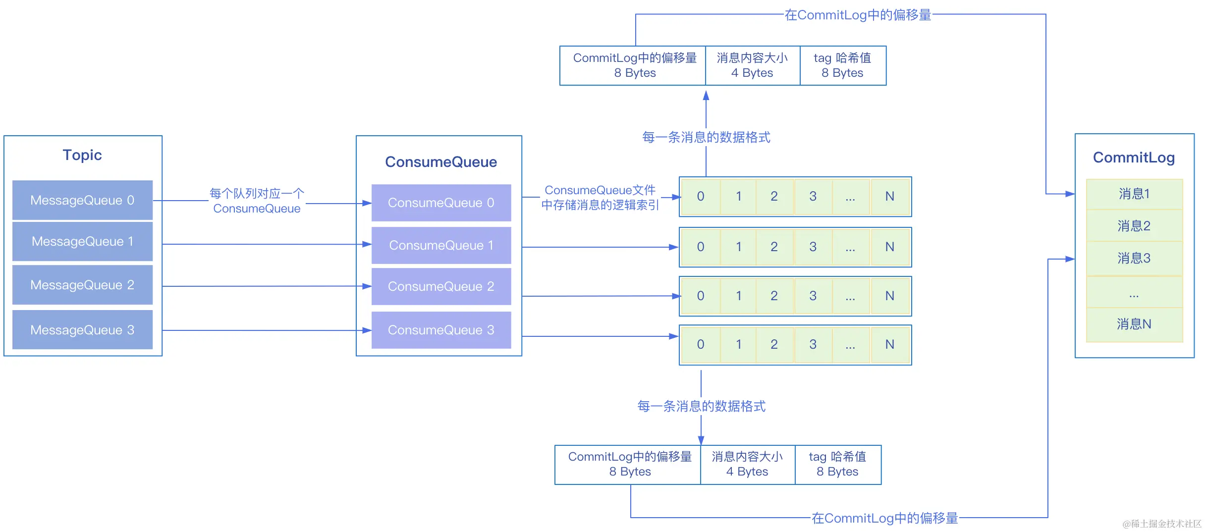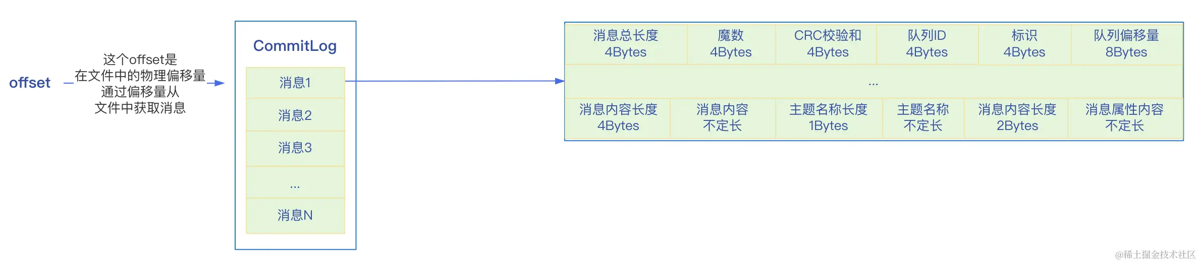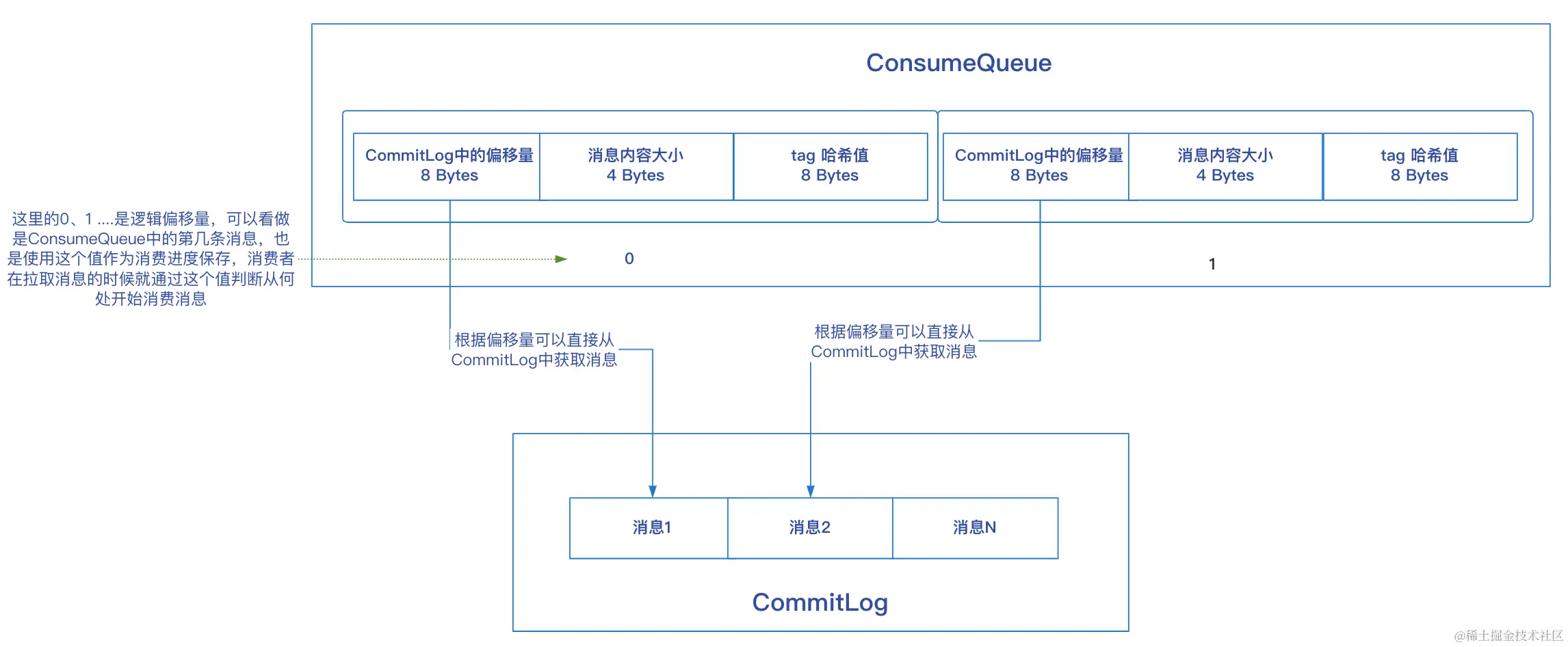 拿到消息队列对应的消费进度时,就可以根据这个值从Broker拉取消息,Broker收到请求后,会根据这个值从ConsumeQueue中获取此条消息在CommitLog中的物理偏移量,根据物理偏移量再从CommitLog中获取消息内容返回给消费者。