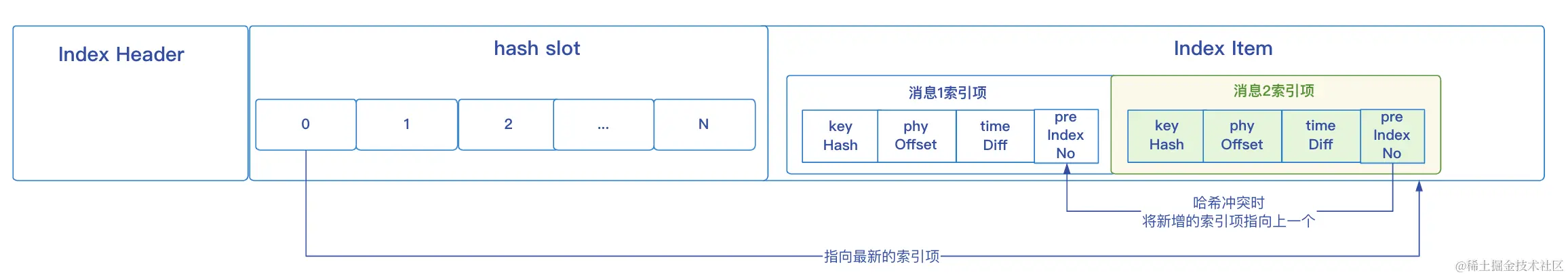 hash slot RocketMQ在每个IndexFile文件中划分了500W个hash槽,在向文件中添加消息索引的时候,会取出消息的Keys(实际会使用Topic + "#" + key进行拼装做为IndexFile文件的Key)计算hash值,然后对hash槽总数取余,来判断应该放到哪个hash槽。