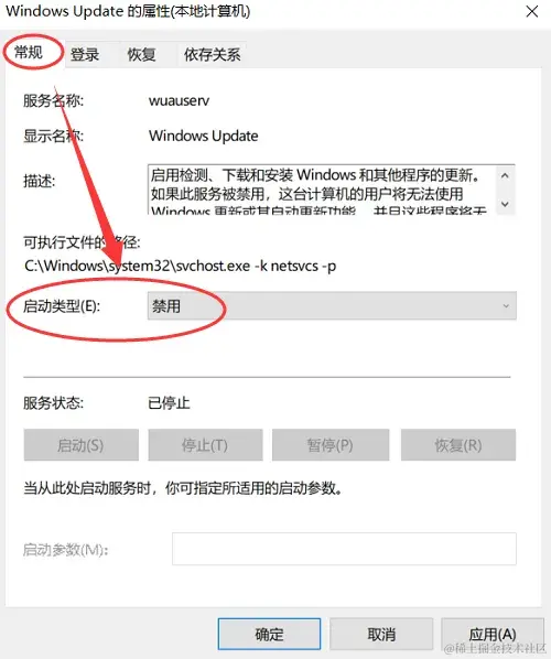 步骤3:在 【常规】 窗口中,将 【启动类型】 改为 【禁用】 。