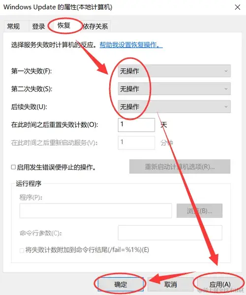 步骤4:再点击 【恢复】 按钮,把下图框选的部分全部改为 【无操作】 。依次点击 【应用】 和 【确定】 按钮即可。