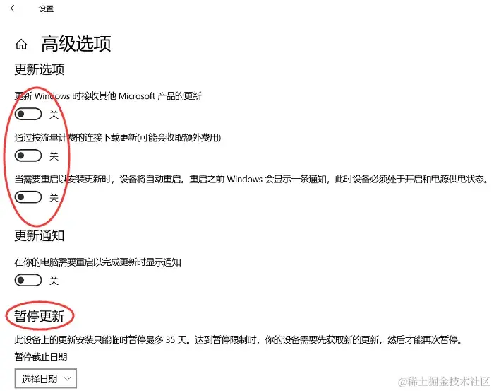 步骤3:在打开的设置界面,把 【更新选项】 下的项目全部关闭,或者选择 【暂停更新】 。