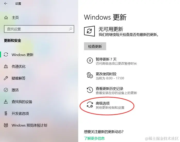 步骤2:在Windows更新界面下,点击 【高级选项】 。