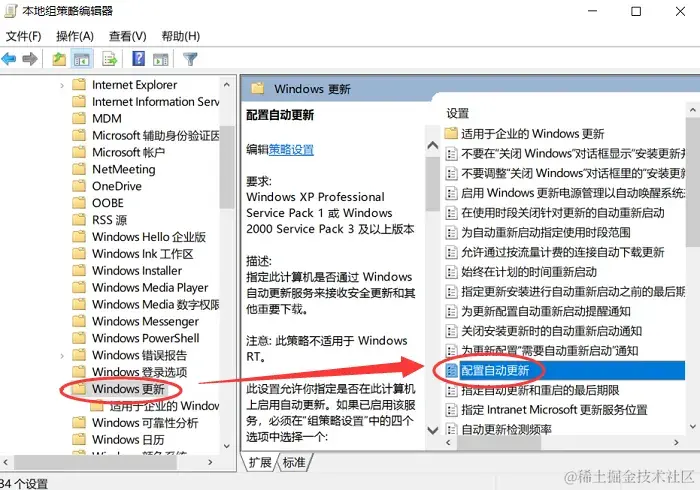 步骤2:转到 【计算机配置】>【管理模板】>【Windows组件】>【Windows更新】 。找到 【配置自动更新】 ,双击打开它。