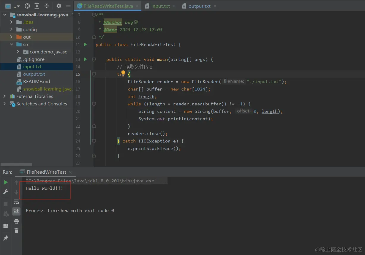 这段代码展示了如何使用Java的FileReader和FileWriter类进行文件的读写操作。